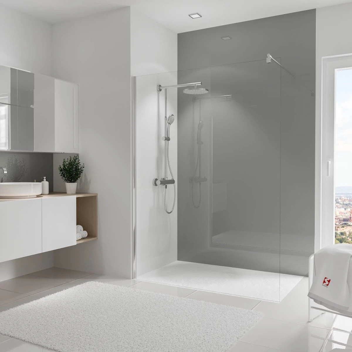 Spécialement pour une utilisation dans la salle de bain et la douche, un mur de fond étanche sans joints. Ces plaques en aluminium avec un noyau en plastique ne font que 3 mm d’épaisseur, ce qui signifie qu’il n’y a pratiquement aucune perte d’espace. Collez simplement sur le carrelage mural existant ou sur toute autre surface plane. Pré- Pré-traitement du support, dégraisser et, si nécessaire, appliquer des bandes de fond de cale. L’assemblage est très simple, découpez les panneaux sur mesure avec une scie sauteuse ou une scie circulaire, retirez le film de protection et appliquez localement le ruban adhésif double face et la colle fournis, appliquez la colle (min. 1-2 tubes par panneau) plus haut que le double- ruban adhésif. Cela permet à la plaque Decodesign de coulisser lors du positionnement avant que le ruban n’adhère. collage avec de la colle silicone ou à l’aide d’une truelle avec encollage complet. Positionner les plaques et bien appuyer pour que la colle et le ruban adhèrent au support. Le ruban n’est qu’une fixation temporaire pour permettre à la colle de se lier. Scellez les Rebords avec du silicone et commencez à utiliser ou à assembler la cabine de douche et les autres articles sanitaires le lendemain. Ces feuilles spécialement laquées imperméables et résistantes aux UV ne conviennent pas seulement pour la salle de bain mais, par exemple, dans la cuisine comme mur arrière. Une multitude de possibilités avec ces parois arrière Deco-design, par exemple dans le salon ou la chambre, le couloir ou l’espace bureau. C’est aussi un produit idéal pour les installations sportives car il est hygiénique, rapide et facile à nettoyer.