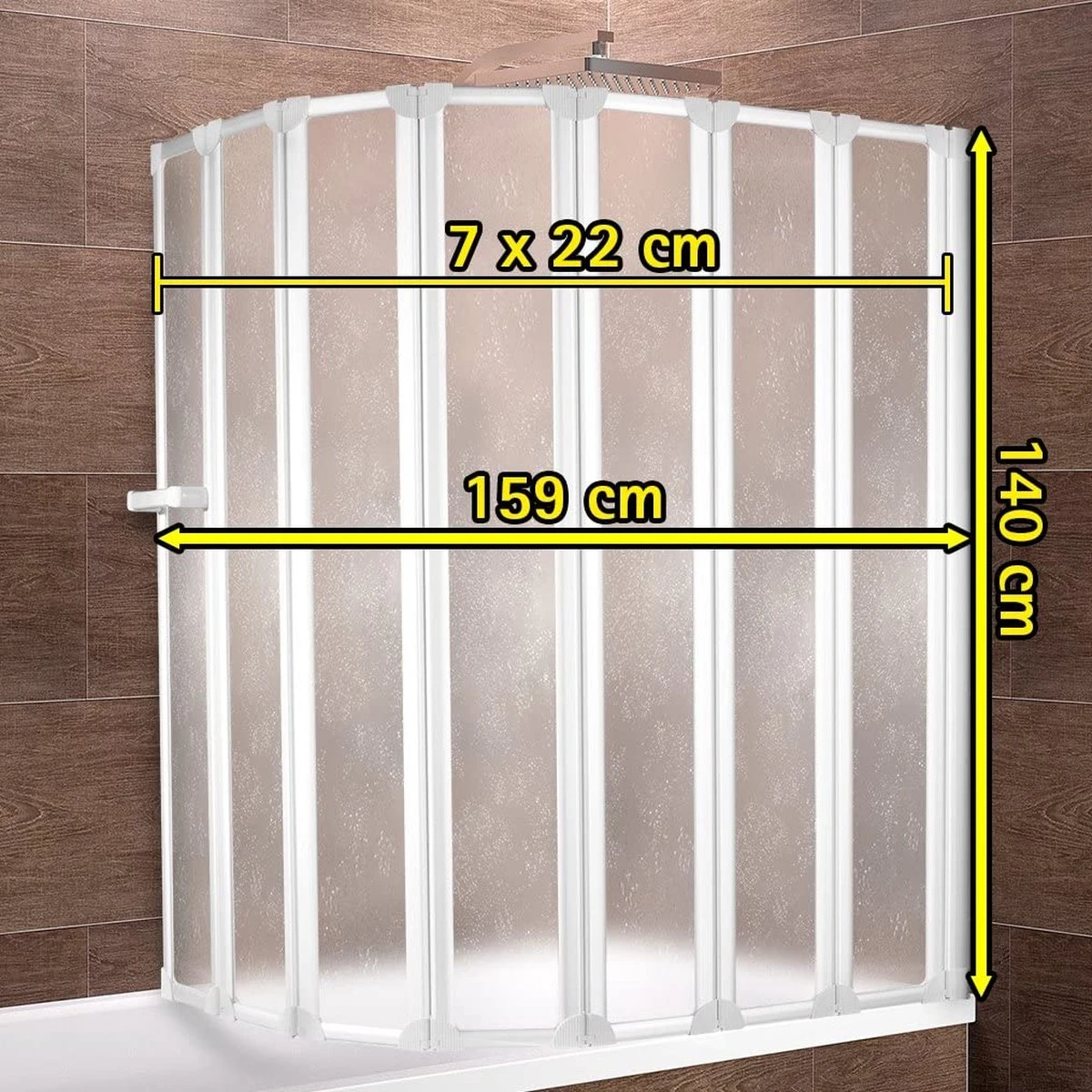 Pare-baignoire avec 7 parties vitrées étroites en verre de sécurité, idéal pour une baignoire ronde ou d’angle. Les parties étroites peuvent être complètement repliées contre le mur pour une entrée pratique dans la baignoire. Pendant la douche dans le bain, il protège contre les éclaboussures d’eau afin que la salle de bain reste propre et sèche.