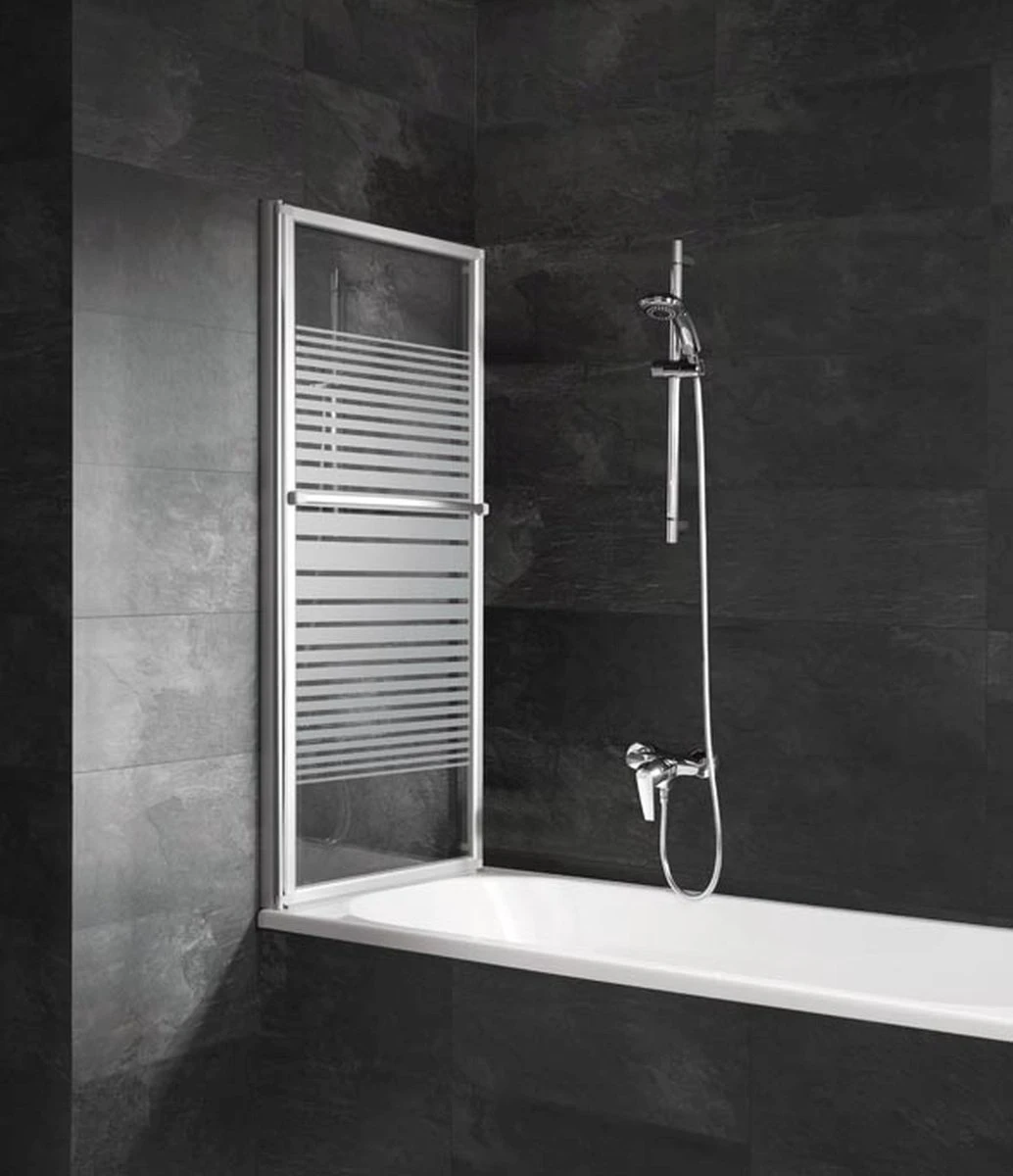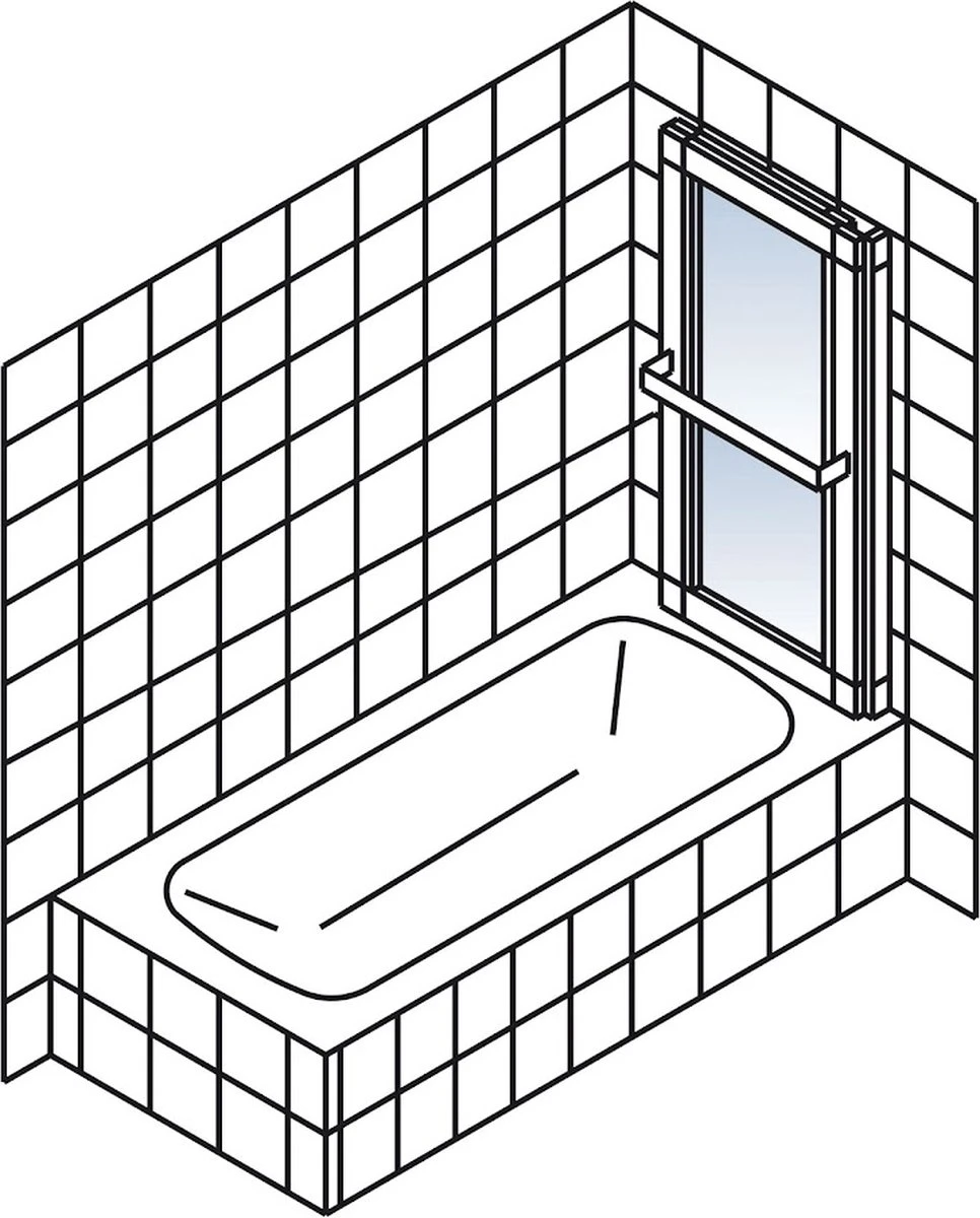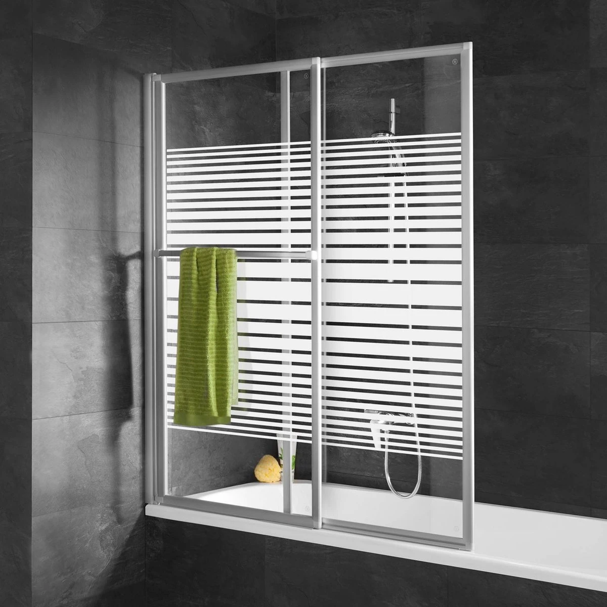 Paroi de bain extensible en 2 parties, pivotante et extensible de 70 à 118 cm, avec porte-serviettes, hauteur 140 cm, verre de sécurité avec décor à rayures 72, couleur du profil aluminium 01, art. D1130 01 72.