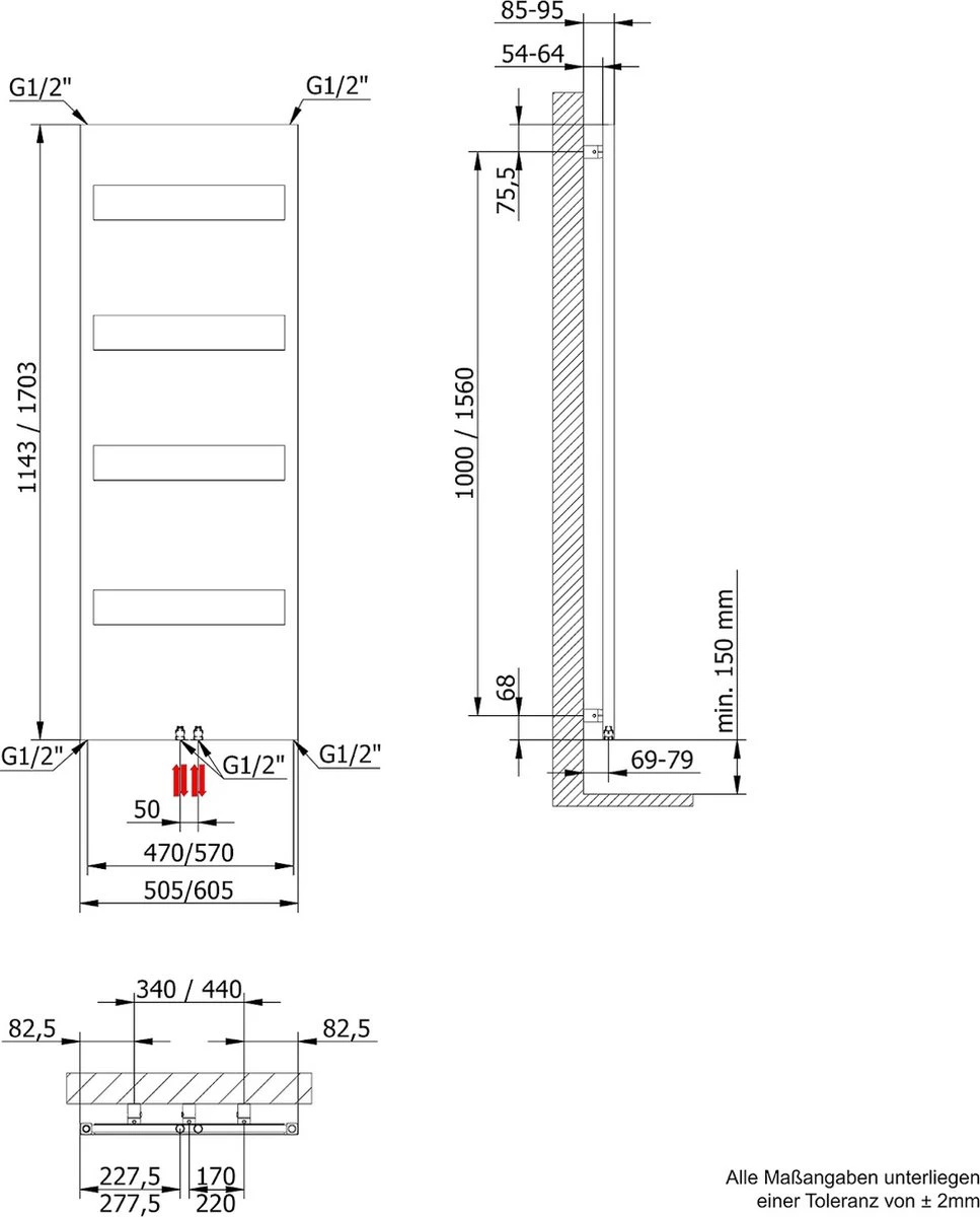 EP170060 57 – 4060991068614Badheizkörper – Turin mit Mittelanschluss, 1703x605x85-95mm (HxBxT), 691W, AnthrazitNameAnthrazitBreite605Höhe1703Tiefe85-95ExpressPlus Lieferung innerhalb von 7-8 Werktagen Sparpreis Produktdetails Anschlüsse unten mittigNabenabstand Mittenanschluss: 50 mmWandabstand: 54 – 64 mmWandabstand Mitte Anschluss: 69 – 79 mmWärmeleistung: 691 WattWärmeleistung nach EN 442 geprüft und registriertVorlauftemperatur des Wassers: 75° CRücklauftemperatur des Wassers: 65° CRaumtemperatur: 20° C„Mittlere“ Temperaturdifferenz: 20° CMaximale Betriebstemdernrnwärlussimaetlernr: 95° CRaumtemperatur: 20° C„Mittlere“ Temperaturdifferenz: 20° CMaximale Betriebstemdernrnwärlussimaetlernratur : 95° 0 MPaNicht geeignet für Einrohr-Systeme3 Jahre Garantie auf die Oberflächenlackierung nach DIN 55900Nicht zum Trocknen tropfnasser Handtücher und Kleidungsstücke geeignetWandbefestigungen und Schrauben (für massive Wände) mitthal en im Lieftenerum. Emfohlender Heizstab en 600 W