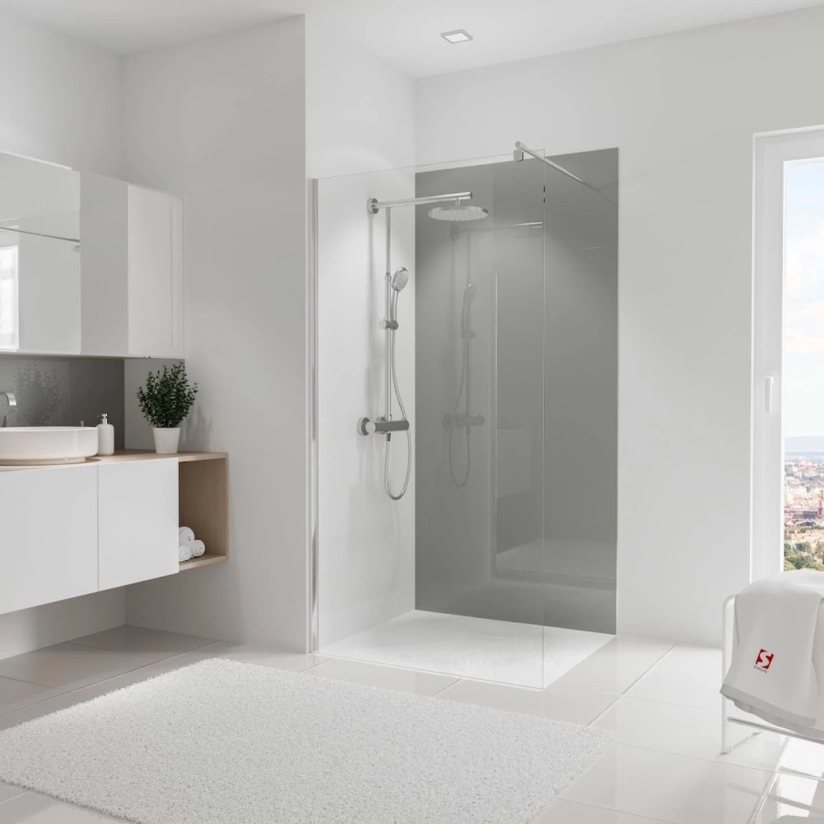 Spécialement pour une utilisation dans la salle de bain et la douche, un mur de fond étanche sans joints. Ces plaques en aluminium avec un noyau en plastique ne font que 3 mm d’épaisseur, ce qui signifie qu’il n’y a pratiquement aucune perte d’espace. Collez simplement sur le carrelage mural existant ou sur toute autre surface plane. Pré- Pré-traitement du support, dégraisser et, si nécessaire, appliquer des bandes de fond de cale. L’assemblage est très simple, découpez les panneaux sur mesure avec une scie sauteuse ou une scie circulaire, retirez le film de protection et appliquez localement le ruban adhésif double face et la colle fournis, appliquez la colle (min. 1-2 tubes par panneau) plus haut que le double- ruban adhésif. Cela permet à la plaque Decodesign de coulisser lors du positionnement avant que le ruban n’adhère. collage avec de la colle silicone ou à l’aide d’une truelle avec encollage complet. Positionner les plaques et bien appuyer pour que la colle et le ruban adhèrent au support. Le ruban n’est qu’une fixation temporaire pour permettre à la colle de se lier. Scellez les Rebords avec du silicone et commencez à utiliser ou à assembler la cabine de douche et les autres articles sanitaires le lendemain. Ces feuilles spécialement laquées imperméables et résistantes aux UV ne conviennent pas seulement pour la salle de bain mais, par exemple, dans la cuisine comme mur arrière. Une multitude de possibilités avec ces parois arrière Deco-design, par exemple dans le salon ou la chambre, le couloir ou l’espace bureau. C’est aussi un produit idéal pour les installations sportives car il est hygiénique, rapide et facile à nettoyer.