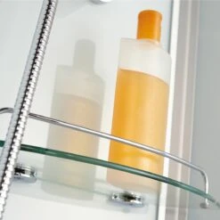 Une grande cabine de douche rectangulaire complète avec un élément fixe en verre en façade à droite (porte ouvrant à gauche). Assemblage facile et rapide grâce au système de clic pratique sans joints en silicone. Fini tout autour avec du verre de sécurité transparent de 5 mm d’épaisseur pour un nettoyage facile. Parois arrière en verre de sécurité vert clair de 4 mm d’épaisseur avec un mitigeur dans l’angle et un ensemble de douche réglable en hauteur et une étagère.