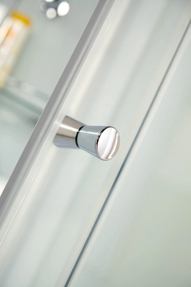 Cabine : Entrée d’angle avec verre sécurit transparent épaisseur 5 mm et profilés aluminium mat, porte coulissante facile à ouvrir grâce aux galets montés sur roulements. La partie de la porte peut être collée sous le rail pour un nettoyage pratique.
