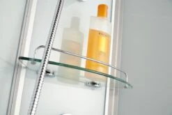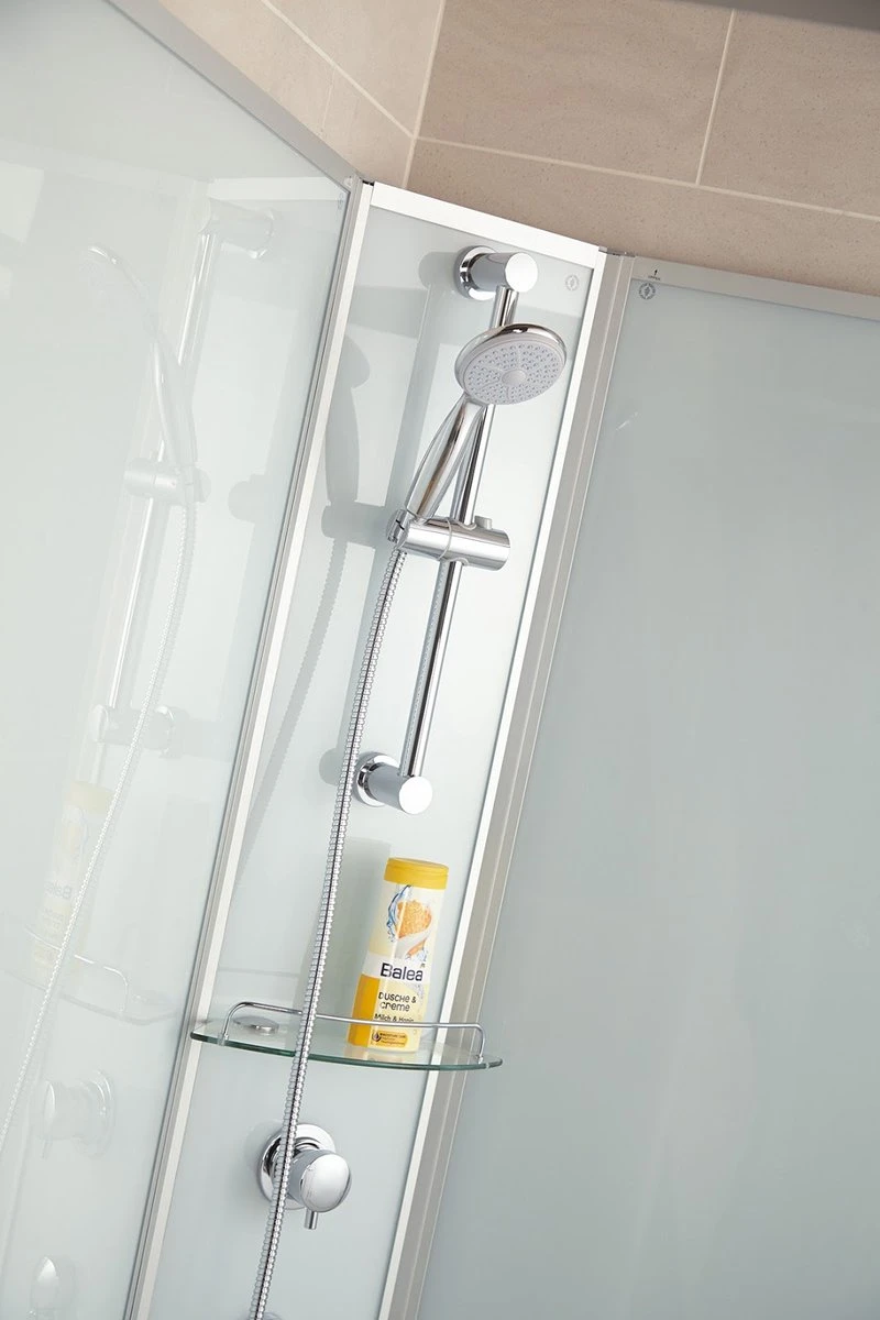 Cabine de douche complète en quart de rond avec portes coulissantes. Assemblage facile grâce au système de clic pratique sans joints en silicone. Fini tout autour avec du verre de sécurité de 4 à 5 mm d’épaisseur pour un nettoyage facile. Parois arrière en verre vert clair avec un mitigeur dans le coin et un ensemble de douche réglable en hauteur et une étagère.