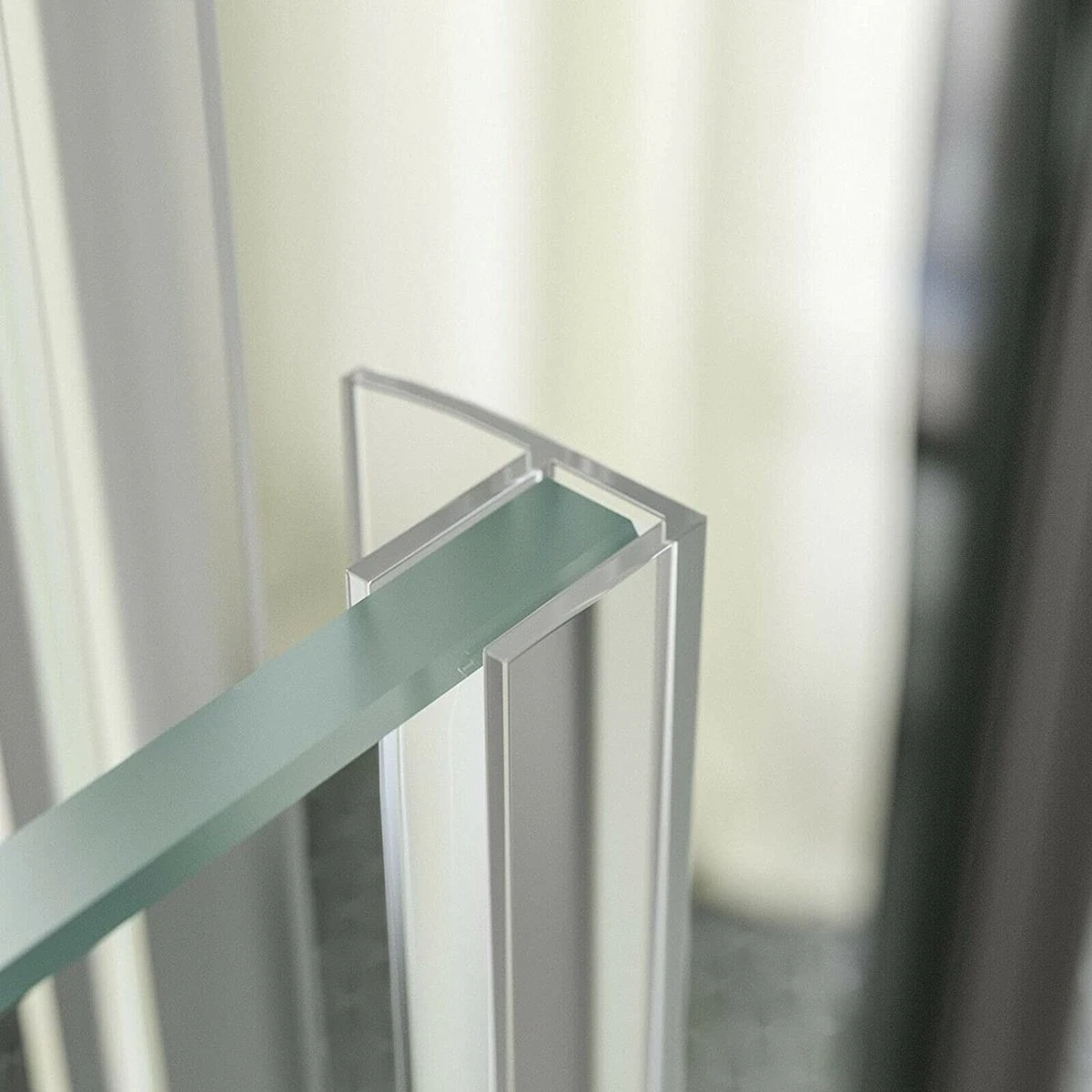 Construction de la cabine : Paroi arrière en plastique sanitaire de couleur blanche avec sorties moulées, mitigeur monocommande avec douchette réglable en hauteur à trois fonctions. Sur le côté gauche, deux parties en verre transparentes en verre de sécurité clair de 5 mm. À l’avant, une seule porte en verre de sécurité transparent de 5 mm d’épaisseur, porte à enroulement tournante complètement vers l’intérieur. Geen de porte battante, également idéal pour les petites salles de bain.