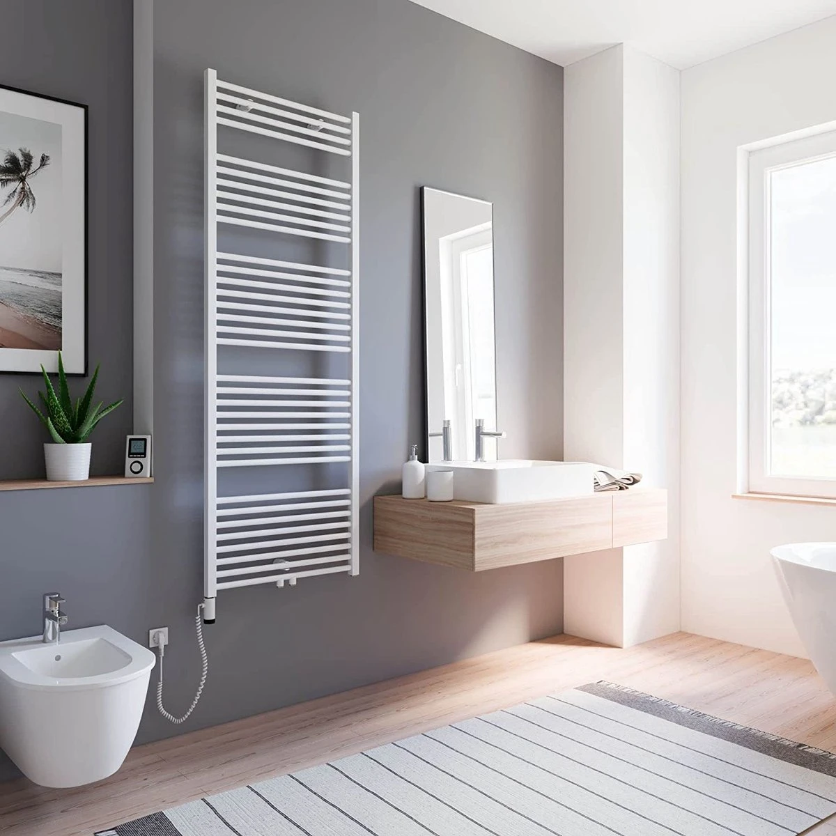 Brancher et utiliser! Cet élément chauffant de type 5 avec télécommande et pré-programmation convient comme chauffage d’ambiance et sèche-serviettes. Ce radiateur électrique est rempli en usine d’eau-glycol, testé avec l’élément chauffant pré-assemblé. Pour chauffer la serviette et chauffer, par exemple, la salle de bain ou la cuisine.