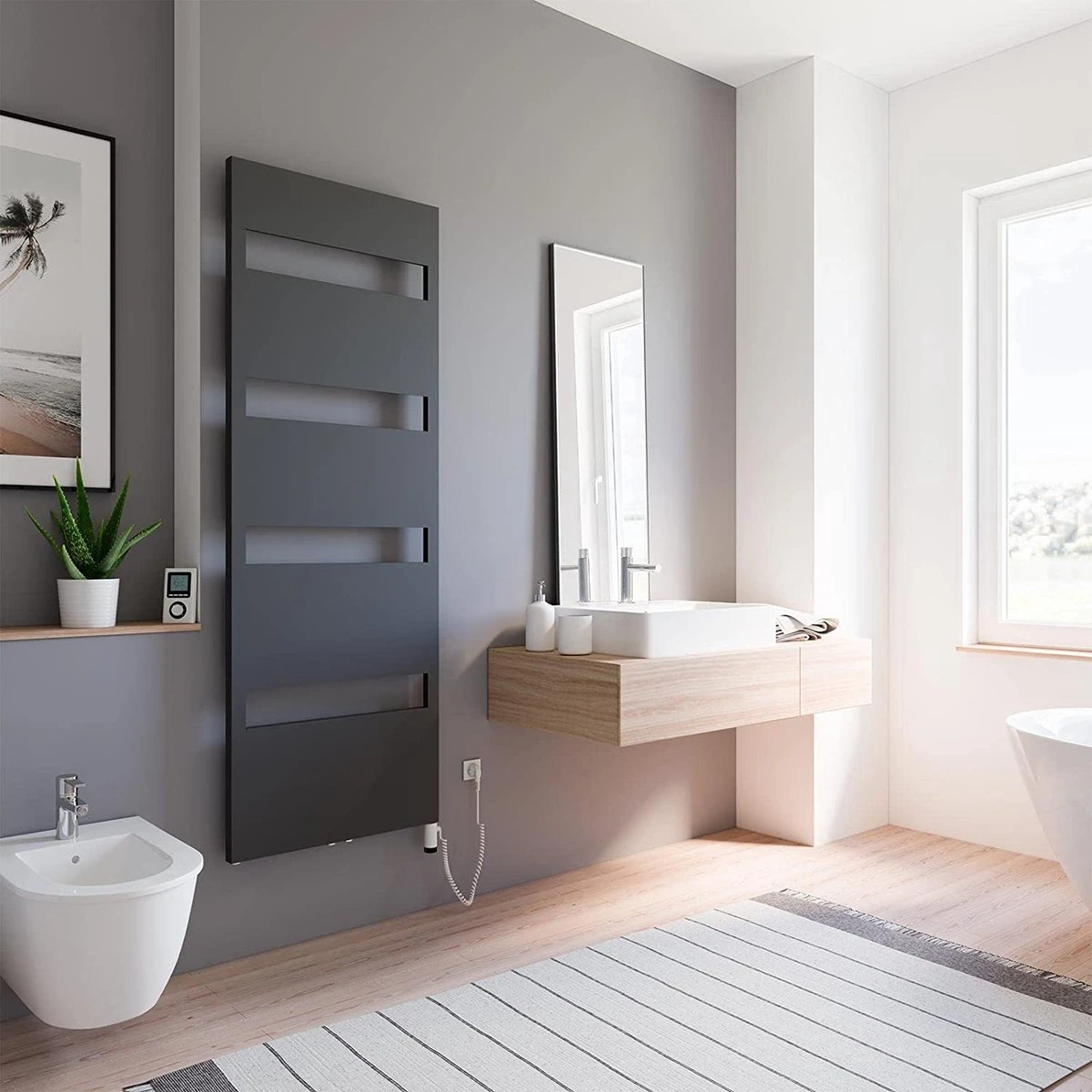 Un radiateur design avec branchement électrique est un radiateur pour sécher les serviettes légèrement humides et les garder au chaud. Un avantage supplémentaire est que la pièce est également légèrement chauffée, ce qui la rend idéale pour la salle de bain et la cuisine comme chauffage d’appoint. L’élément chauffant doit toujours se trouver en bas du radiateur ! Le mélange d’environ Glycol 10% assure une répartition optimale de la chaleur et protège également du gel jusqu’à -5°C.