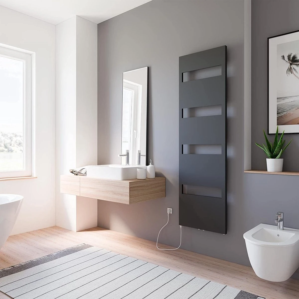 Un radiateur design avec branchement électrique est un radiateur pour sécher les serviettes légèrement humides et les garder au chaud. Un avantage supplémentaire est que la pièce est également légèrement chauffée, ce qui la rend idéale pour la salle de bain et la cuisine comme chauffage d’appoint. L’élément chauffant doit toujours se trouver en bas du radiateur ! Le mélange d’environ Glycol 10% assure une répartition optimale de la chaleur et protège également du gel jusqu’à -5°C.